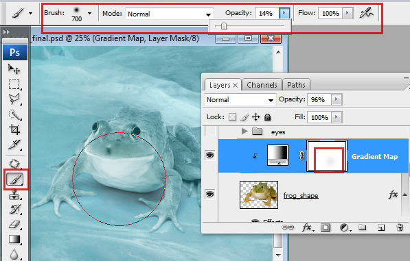 Copy selected frog shape and paste it into a new layer – "frog shape" on the screen shot. Duplicate original frog layer. Make one of the duplicates invisible(original frog layer will be needed in the future steps), and make second one black & white. We will keep black and white layer to save shadow effect from the original image -" frog_bl&wh_shadow" layer on the screen shot. To make layer monochrome, go to Image > Adjustments > Black and White. In order to hide white background, apply Multiply Blending Mode and Opacity 75%.